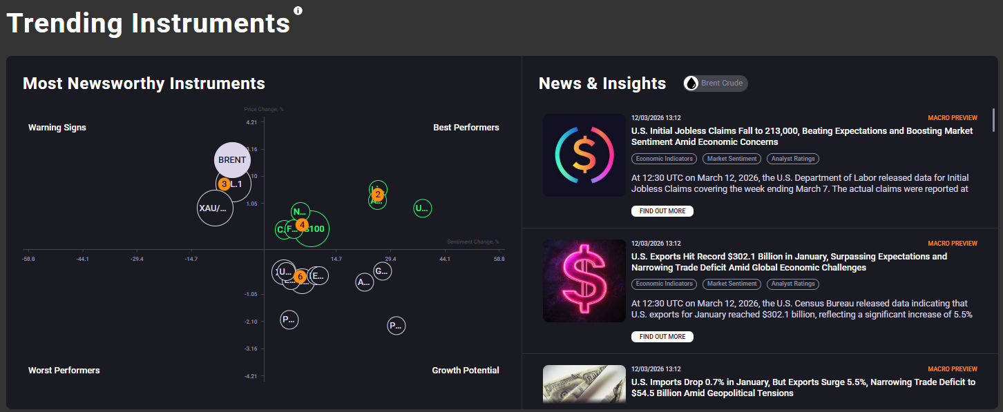 The "Trending Instruments" section is the visual heart of NewsIQ. It identifies potentially profitable assets by tracking their popularity (News Volume) and News Sentiment in real-time.